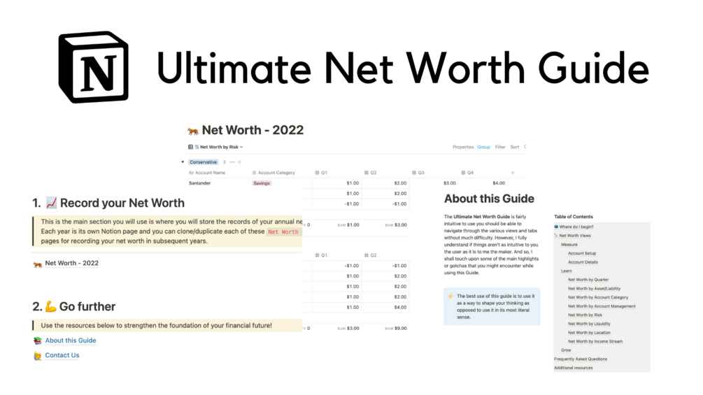 The Ultimate Net Worth Guide provides a framework to track your Net Worth and gives you insight into exposure to various types of risk. With this template you will be able to -